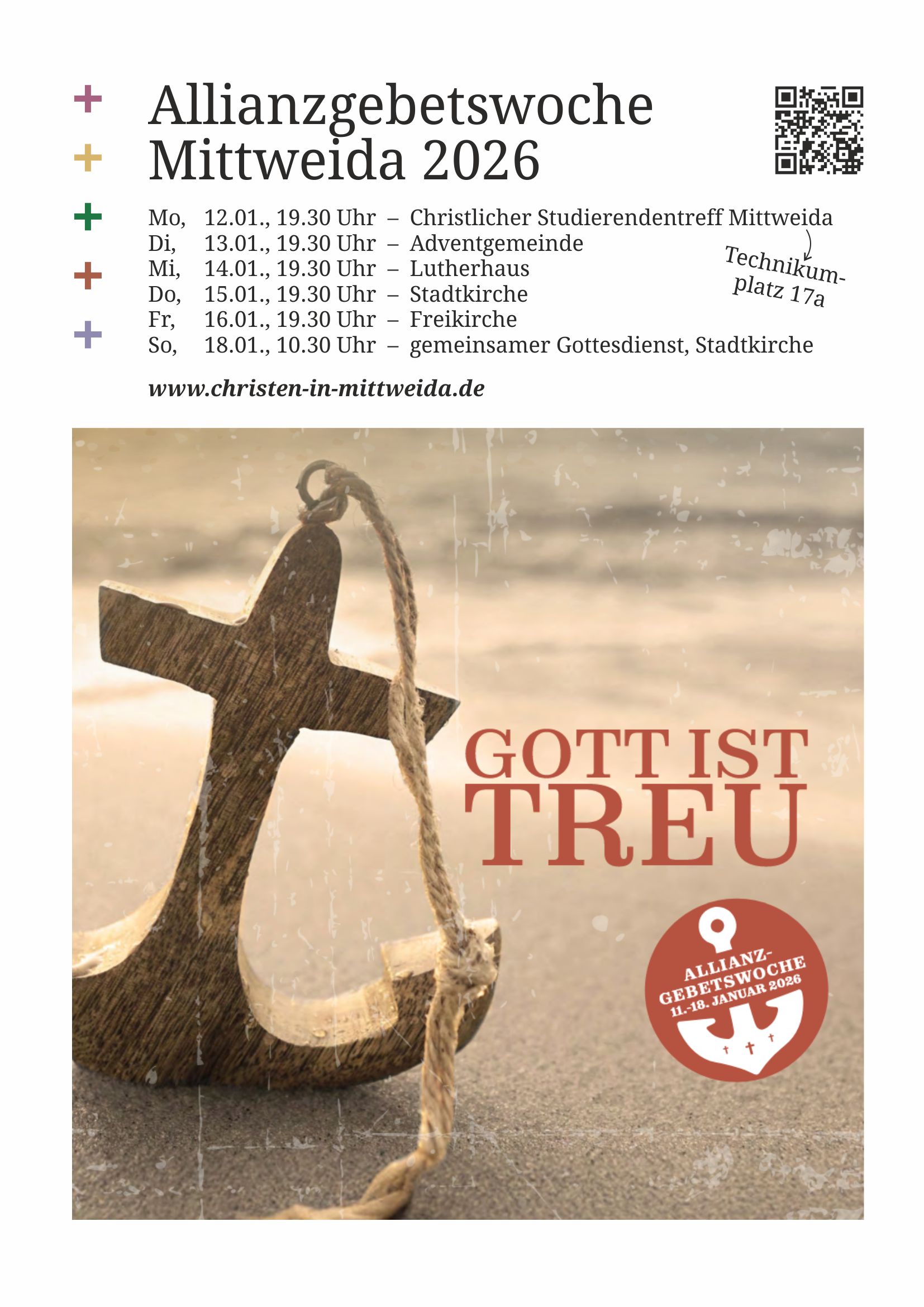 Als Christen unterschiedlicher Tradition und Prägung sind wir verbunden im Glauben an den Gott der Bibel. Wir gehören zwar unterschiedlichen Kirchen und Gemeinden in Mittweida an, sehen uns aber nicht als Konkurrenten, sondern als Brüder und Schwestern, weil wir einen gemeinsamen himmlischen Vater haben.